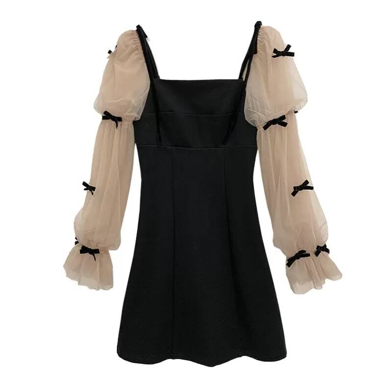 【Mサイズ/ブラック&シースルー】ミニワンピース ミニスカート ワンピース リボン シースルー
