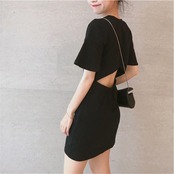 【XLサイズ/ブラック】背中開き ミニ ワンピース バックデザイン ウエストゴム 半袖 バックシャン